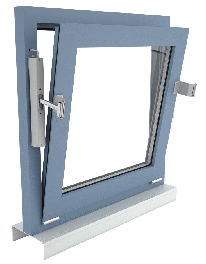 Einwärts öffnende Fassadenfenster, Antriebsmontage auf dem Fensterrahmen