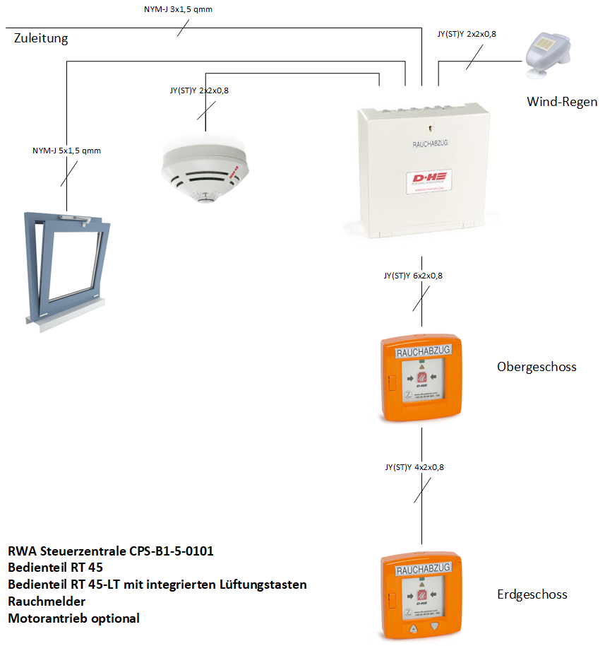 Bei RWA Treppenhausanlagen werden in der Regel ein bis zwei Fenster oder Entrauchungsklappen bedient. Der Aufbau von RWA Treppenausanlagen ist in der in der Grundkonfiguration nahezu identisch weil der Aufbau nach Vorgaben der Landesbauordnung erfolgen muss. Abweichungen richten sich nach Anzahl der Entrauchungsöffnungen, Leistungsaufnahme der Motorantriebe und zusätzlichen Komfortlösungen wie tägliche Lüftung oder weiteren Funktionen.